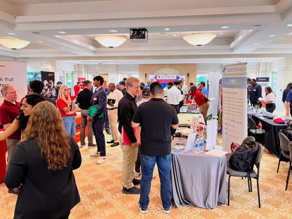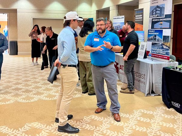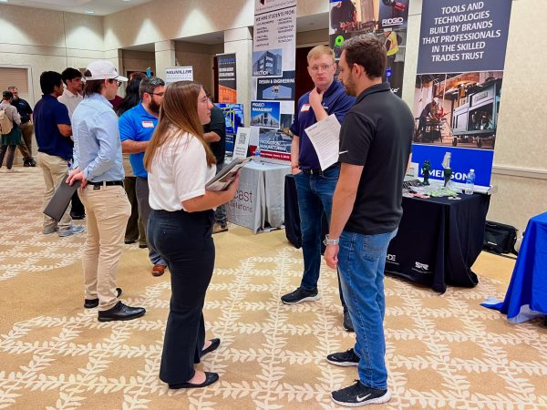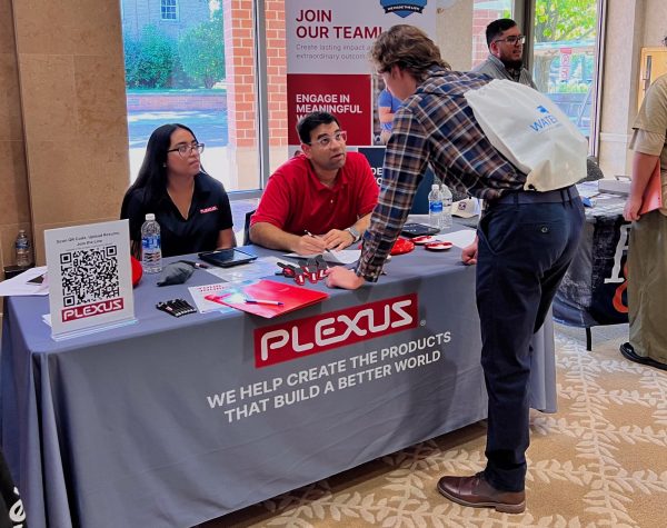 Meghana Undi, a computer science graduate student, (left) gives her resume to Etnyre & Co. Talent Acquisition Specialist Erika Davis (right) on Tuesday during the College of Engineering and Engineering Technology Job and Internship Fair. CEET holds fairs in the fall and spring and the next one will be Feb. 17 at the Barsema Alumni and Visitor’s Center. (Sofia Howell | Northern Star)